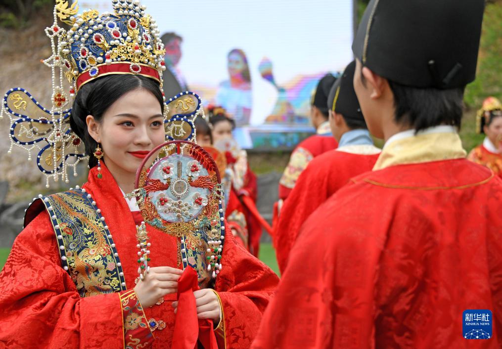 5月20日,在浙江省台州市仙居县神仙居景区南天顶,新人参加宋韵集体婚礼。(新华社发 王华斌 摄)