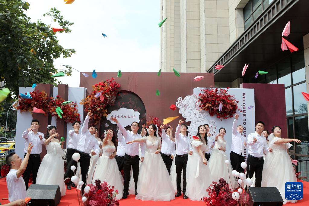 5月20日,新人在重庆市永川区集体婚礼上放飞纸飞机。(新华社发 陈仕川 摄)