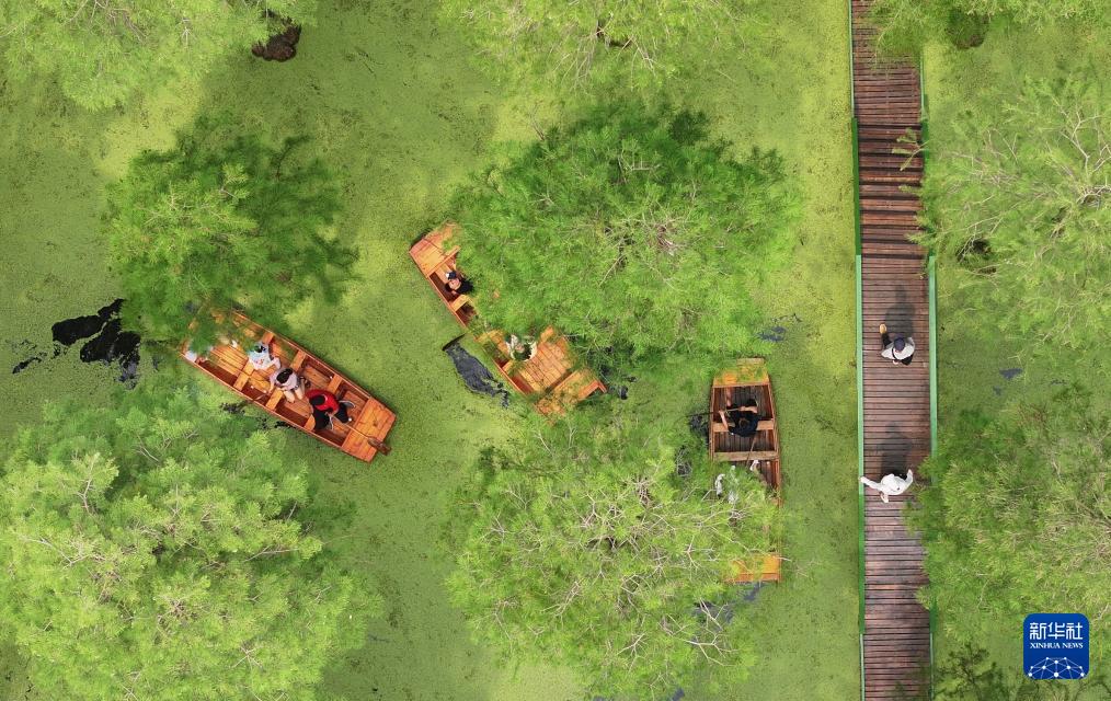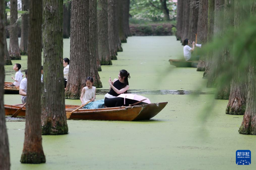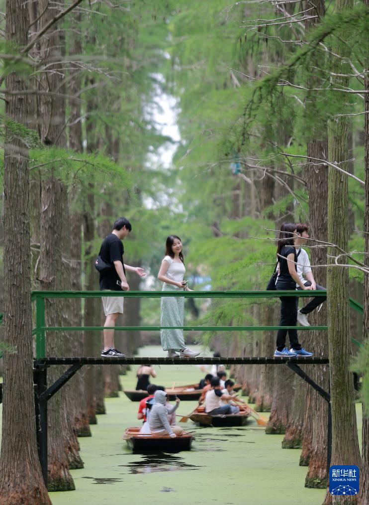 初夏时节,江苏省扬州市渌洋湖湿地公园内“水上森林”葱郁清凉,成为游客休闲避暑的好去处。