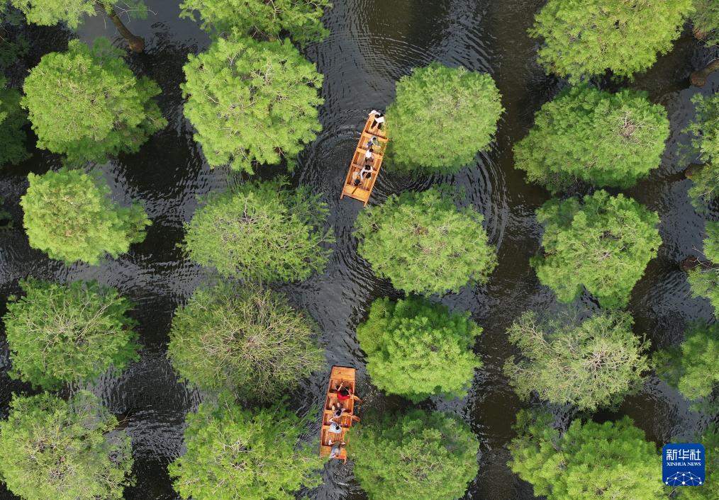 5月26日,游客在江苏省扬州市渌洋湖湿地公园的“水上森林”乘船游览(无人机照片)。(新华社发 孟德龙 摄)