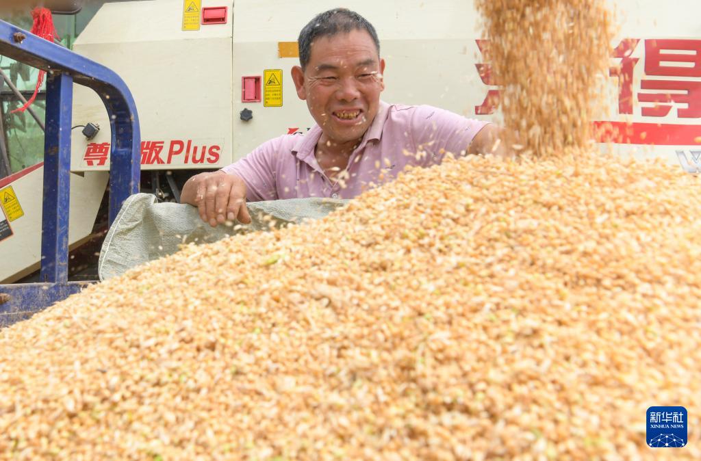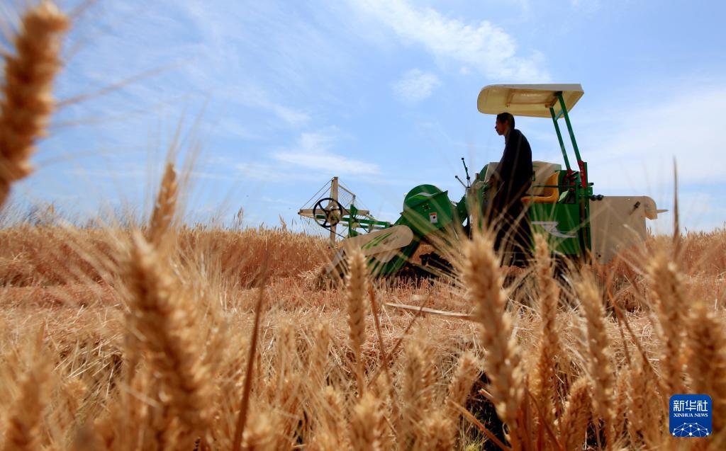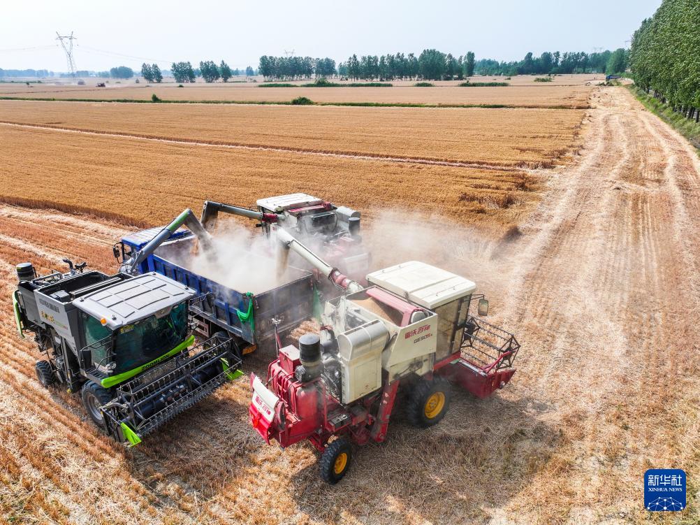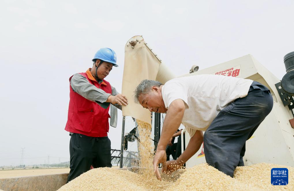5月27日,河南省洛阳市新安县铁门镇崔家庄村的村民在收获小麦。(新华社发 张怡熙 摄)