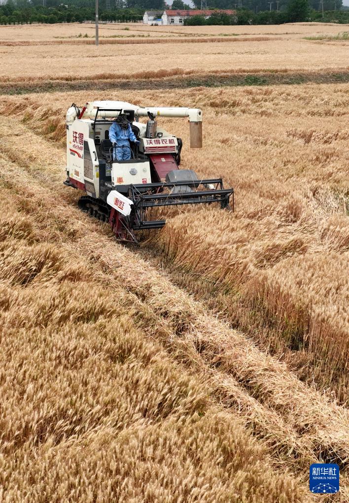 5月27日,江苏省淮安市洪泽区三河镇农民驾驶农机收割小麦(无人机照片)。(新华社发 万震 摄)