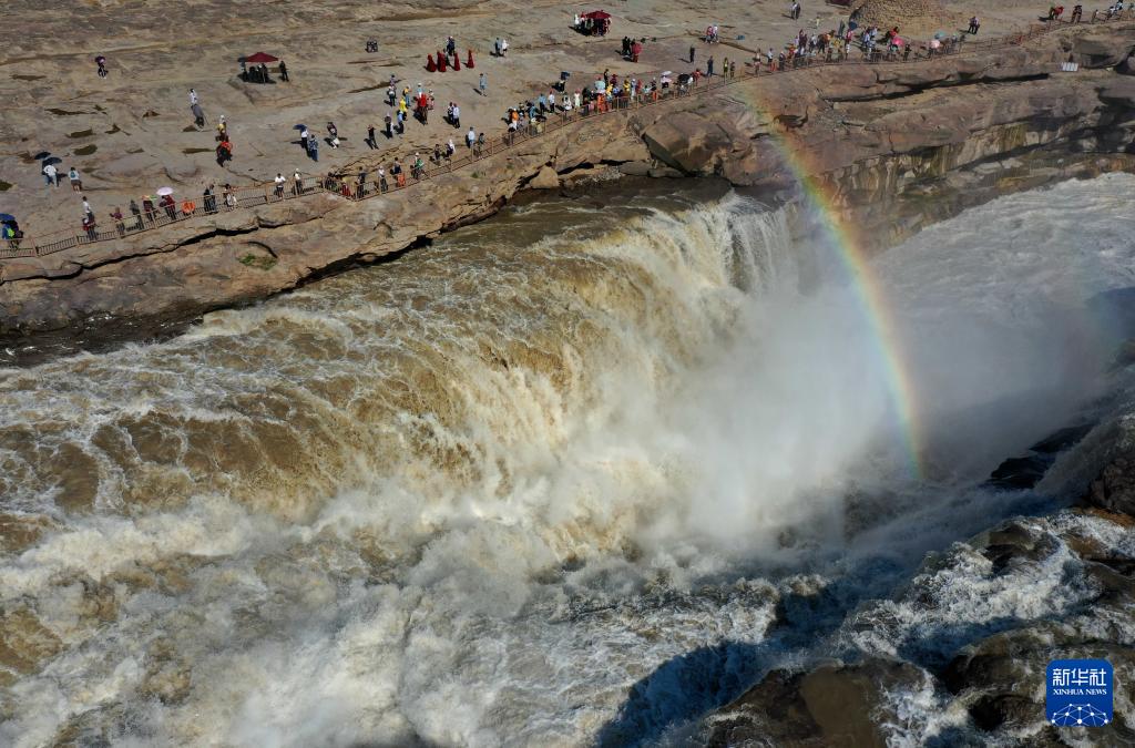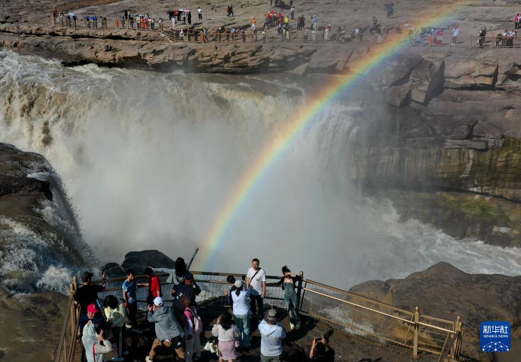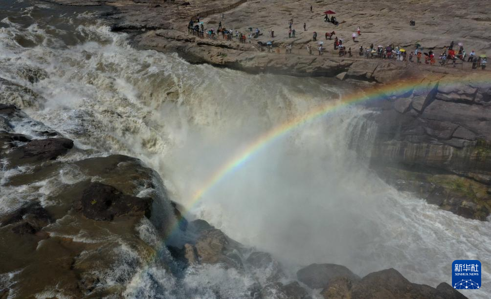 5月27日,游客在黄河壶口瀑布观赏“彩桥通天”景观(无人机照片)。(新华社发 吕桂明 摄)