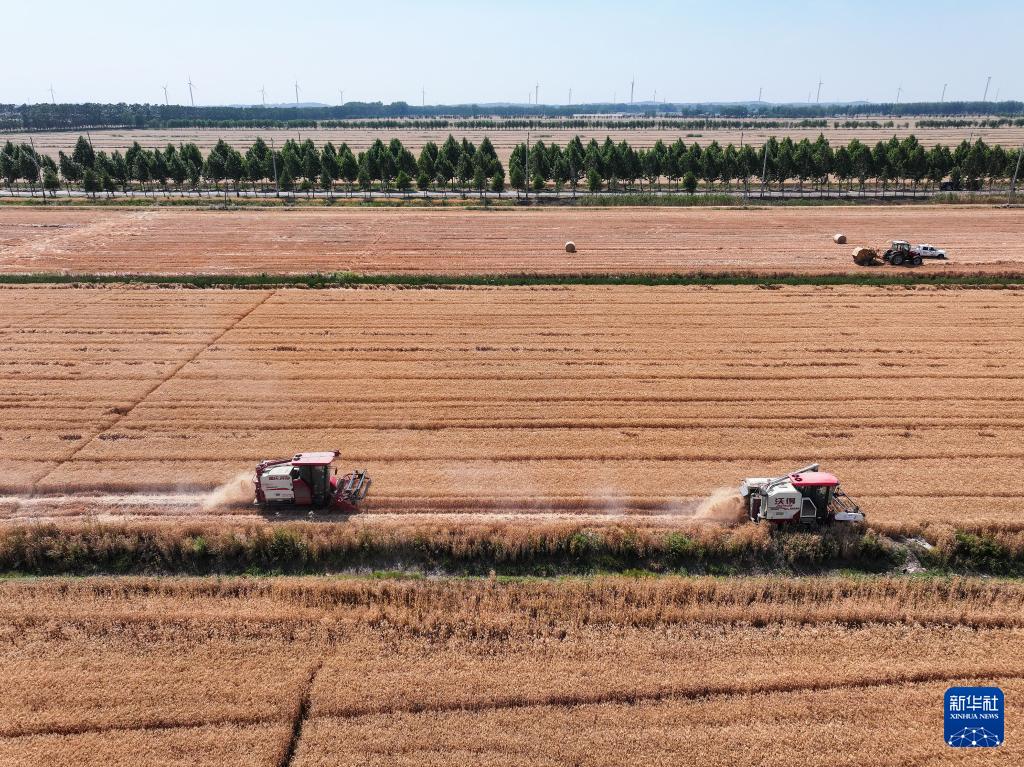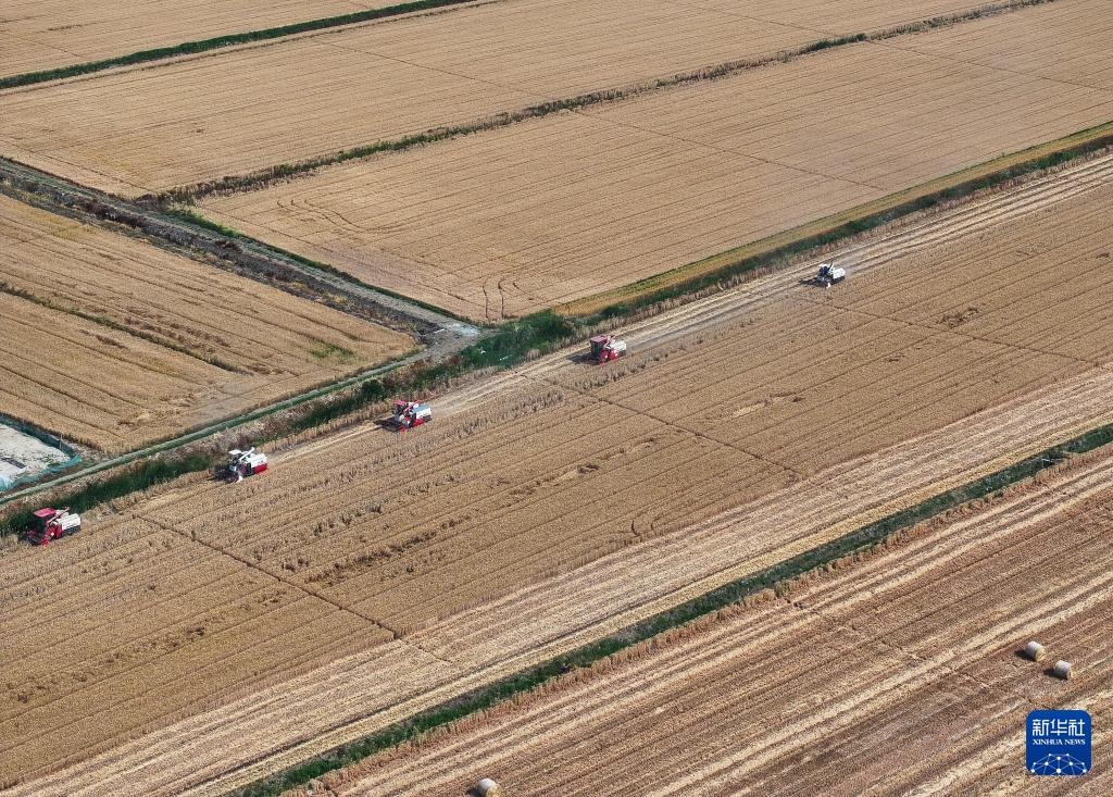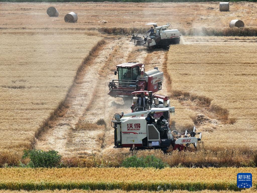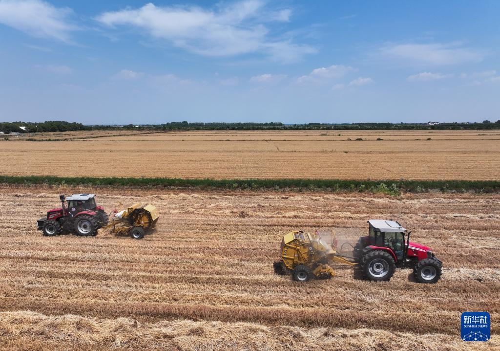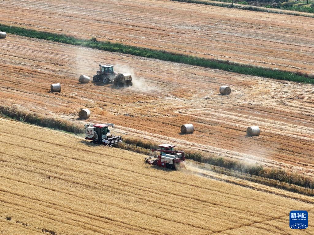 5月28日,位于江苏盱眙洪泽湖畔的江苏农垦三河农场3.82万亩小麦开镰收割。50多台收割机开进四个生产作业区,搂草机、打捆机、叉车各司其职,机械化作业一气呵成。