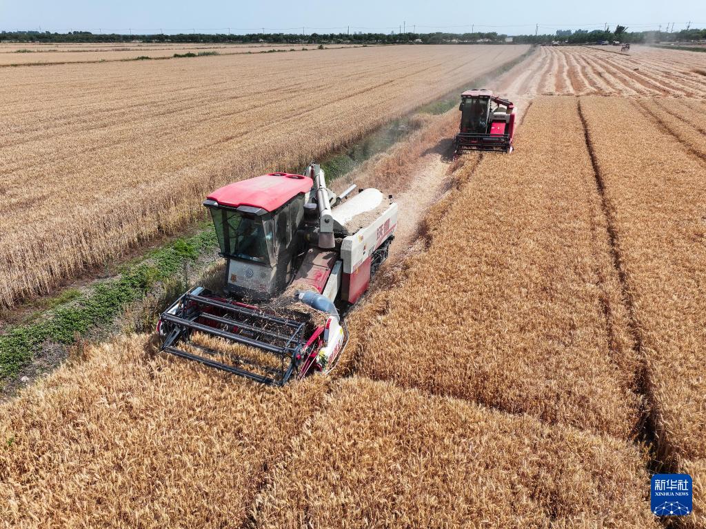 5月28日,农机在江苏农垦三河农场麦田作业(无人机照片)。(新华社记者 季春鹏 摄)