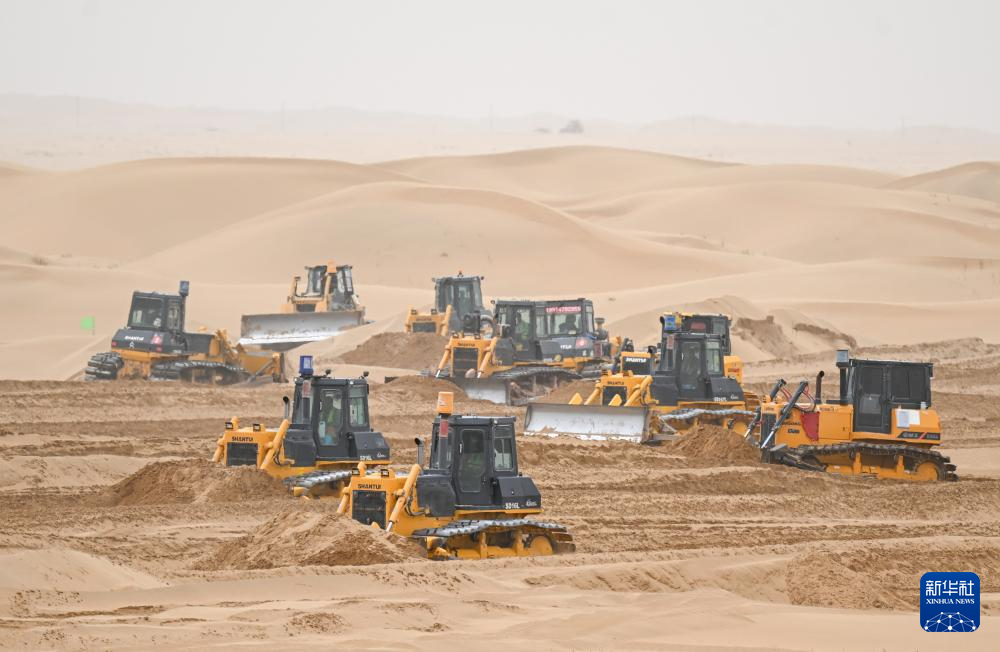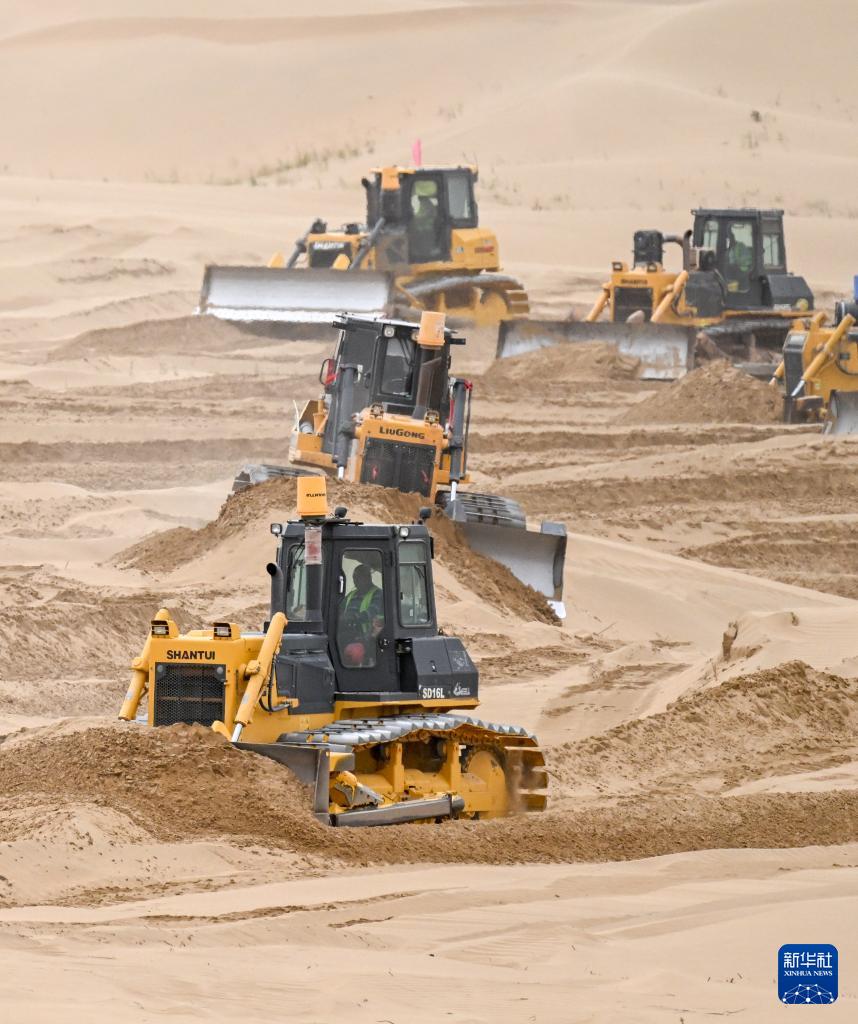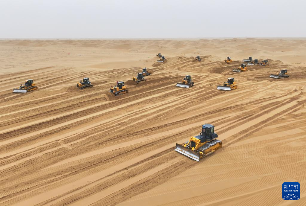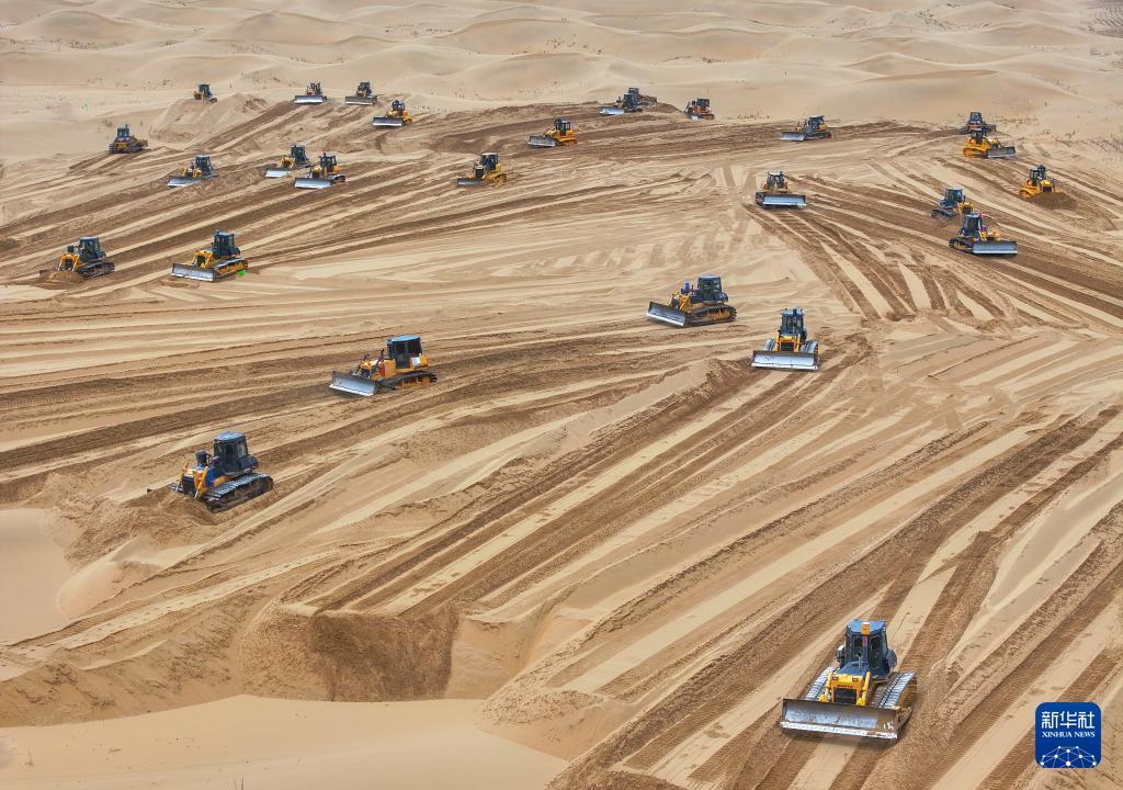 5月29日,在内蒙古鄂尔多斯市杭锦旗黄河“几字弯”荒漠化综合防治库布其沙漠治理现场,工人在穿沙公路两侧植树造林、工程机械推平沙漠为光伏装机做准备。杭锦旗对库布其沙漠采取“北缘锁边、南部围堵、西部封禁、中部切割、东部削平”的治理措施,力争实现荒漠化、沙化土地面积持续“双缩减”。