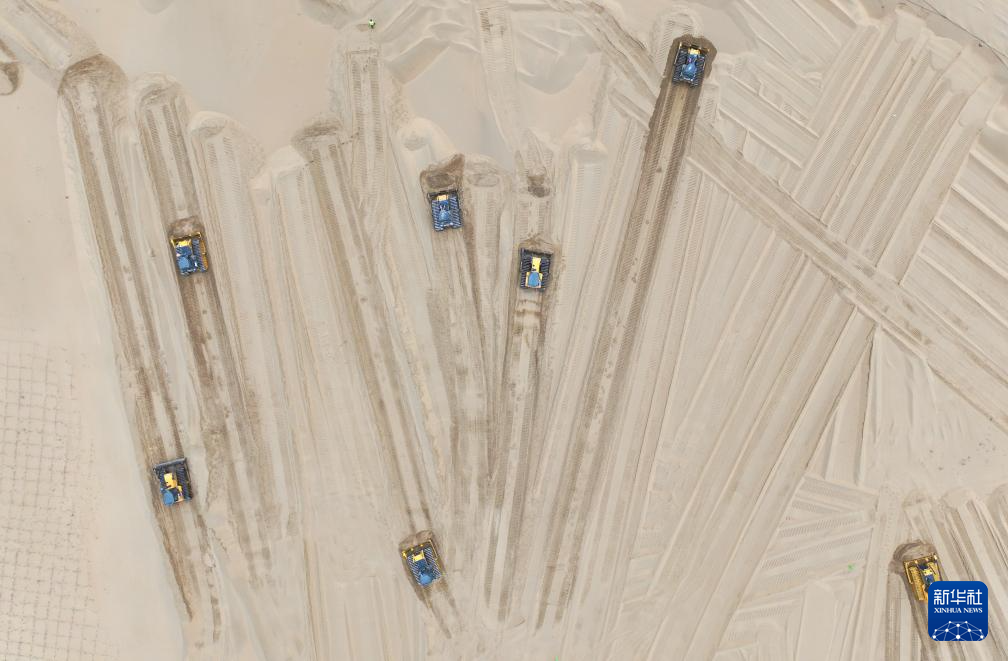5月29日,在杭锦旗朔方新能源大基地建设现场,工程机械在施工(无人机照片)。(新华社记者 连振 摄)