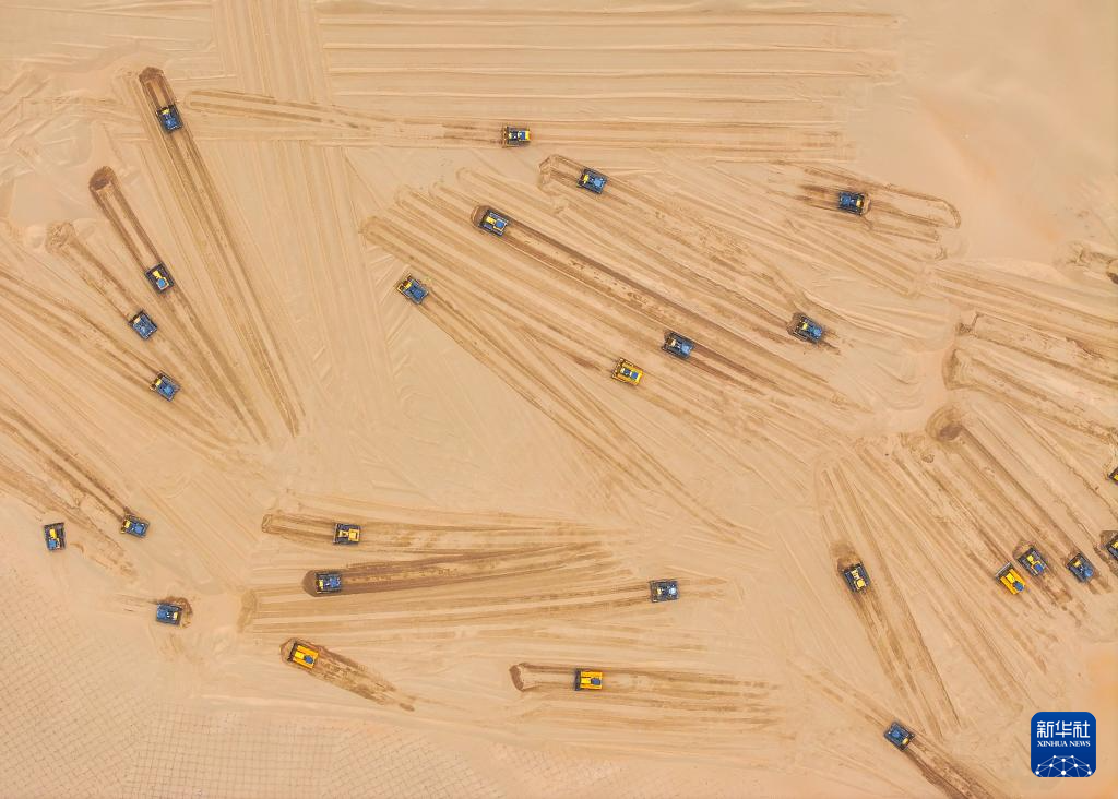 5月29日,在杭锦旗朔方新能源大基地建设现场,工程机械在施工。(新华社记者 连振 摄)