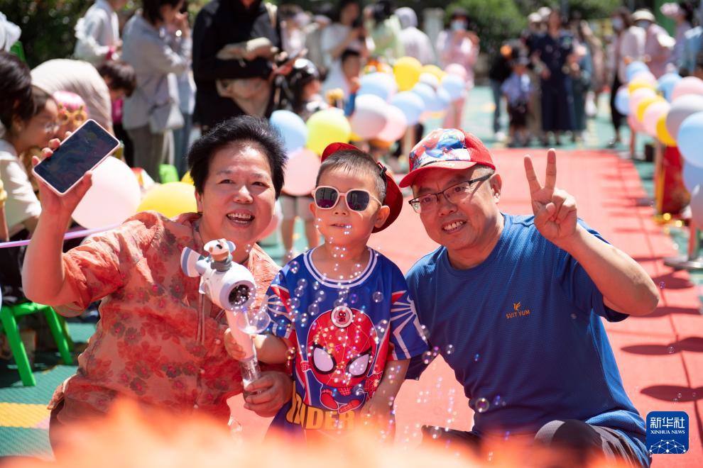 5月29日,在安徽省人民政府机关幼儿园望湖分园,小朋友和家长在活动中合影。(新华社记者 傅天 摄)