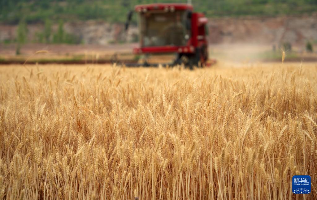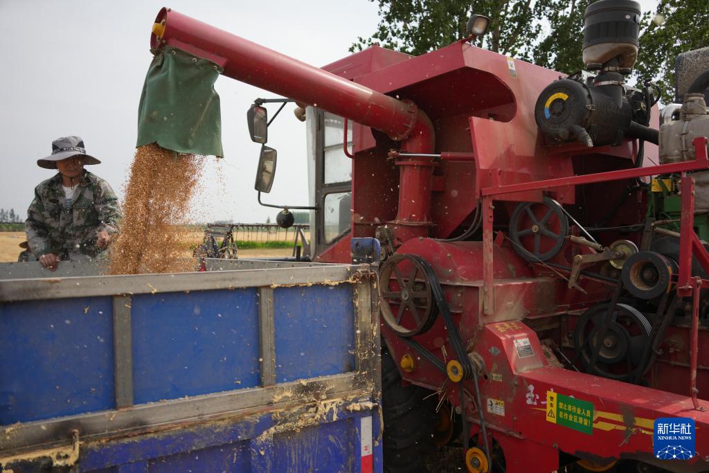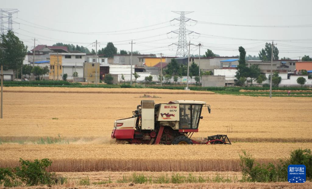 5月29日,在山东省滕州市东沙河街道,农机手驾驶收割机收割小麦。(新华社记者 徐速绘 摄)