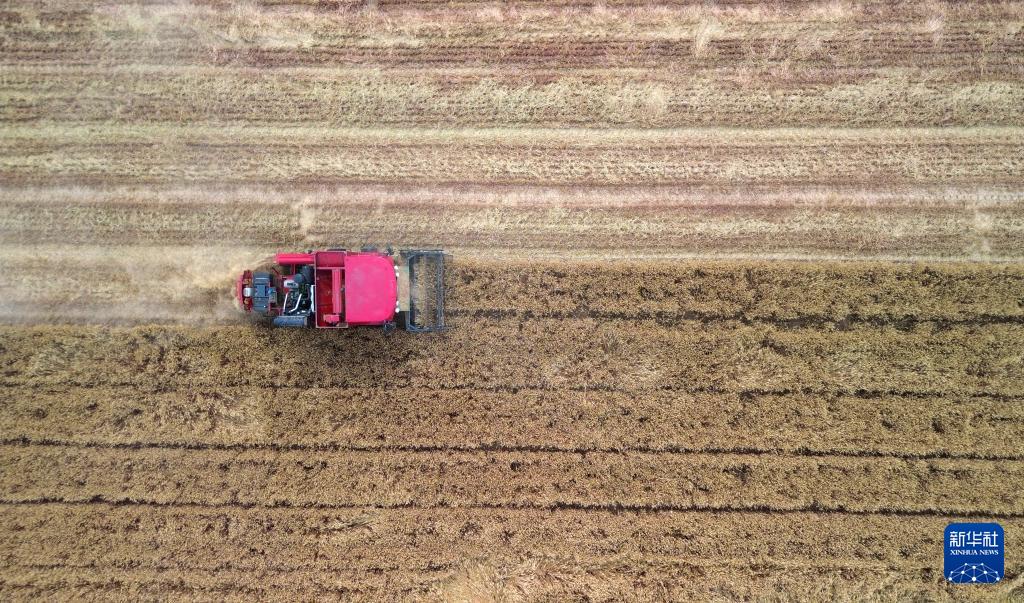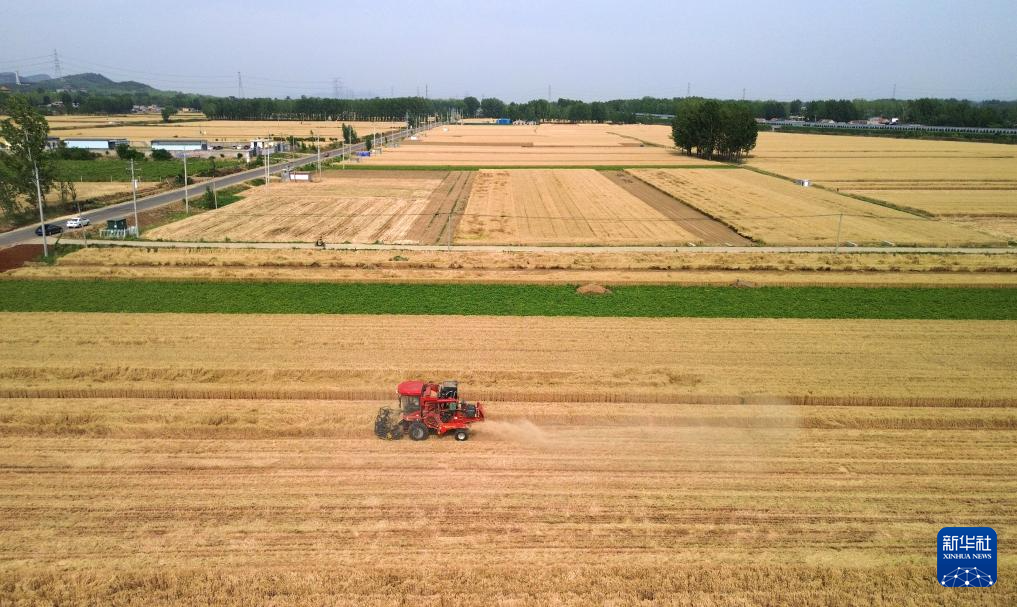 5月29日,在山东省滕州市大坞镇,农机手驾驶收割机开展小麦收割作业(无人机照片)。(新华社记者 徐速绘 摄)
