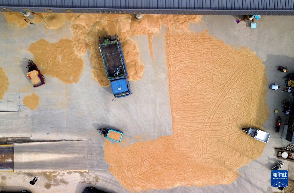 5月29日,在山东省滕州市大坞镇,村民在晾晒刚收获的小麦(无人机照片)。(新华社记者 徐速绘 摄)