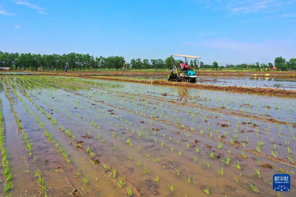 5月30日,山东省青岛市即墨区蓝村街道青香水稻种植专业合作社的农民在管理秧苗。(新华社发 梁孝鹏 摄)