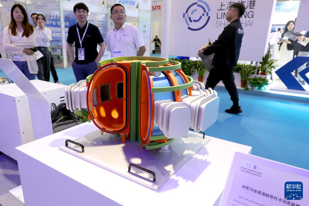 6月12日在展览现场展出的洪荒70全高温超导托卡马克装置模型。(新华社记者 方喆 摄)