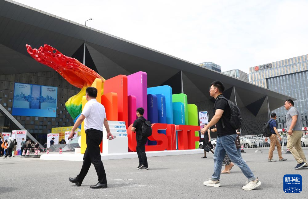 6月12日,参观者从第十届中国(上海)国际技术进出口交易会迎宾展板前走过。(新华社记者 方喆 摄)