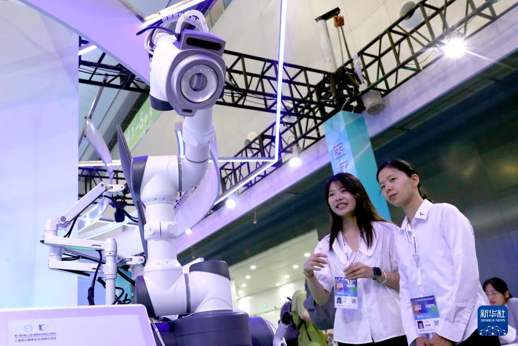 6月12日,观众在交易会上参观超声治疗机器人。(新华社记者 方喆 摄)