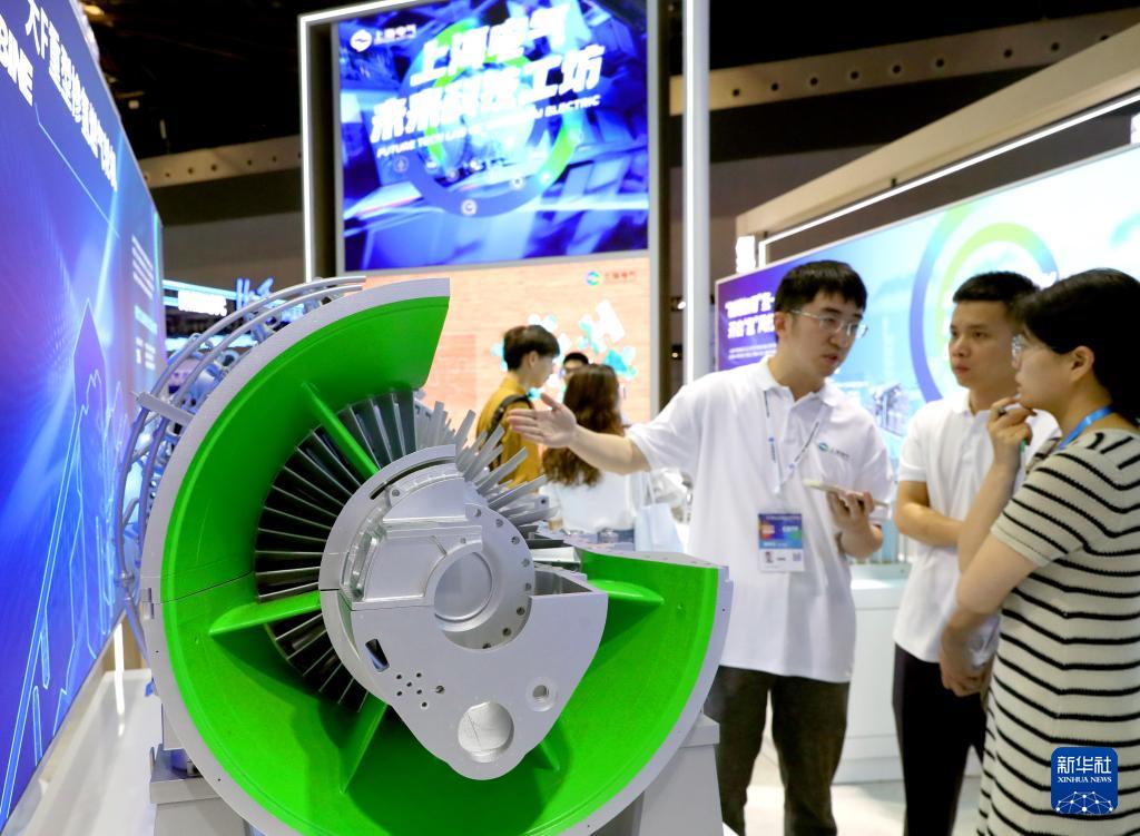 6月12日,工作人员(右三)向参观者介绍重型掺氢燃气轮机模型展品。(新华社记者 方喆 摄)