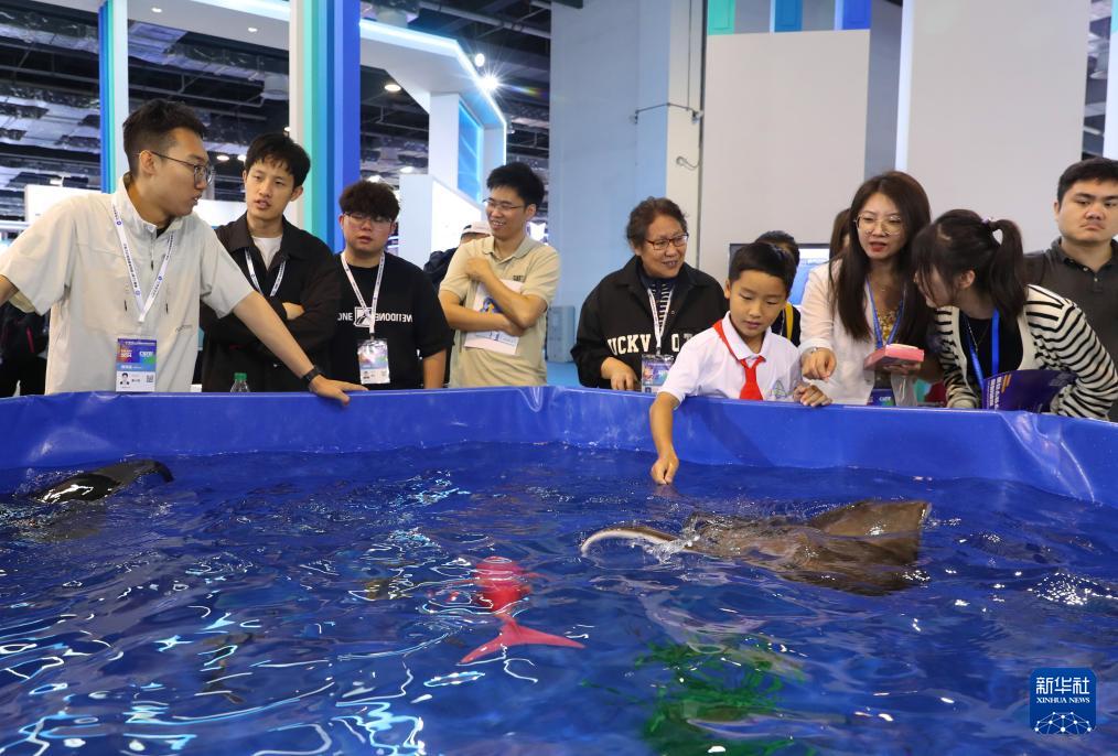 6月12日,参观者在上海海洋大学“文鳐”智能软体仿生蝠鲼演示水池旁驻足参观。(新华社记者 方喆 摄)