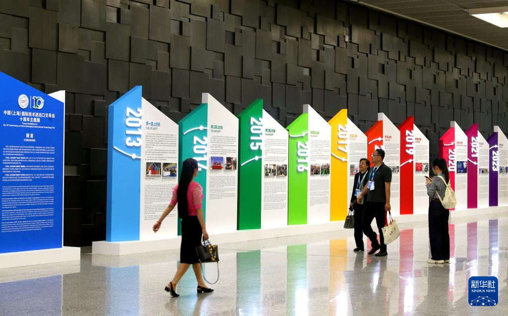 6月12日,参观者从中国(上海)国际技术进出口交易会十周年主题展的展板前走过。(新华社记者 方喆 摄)