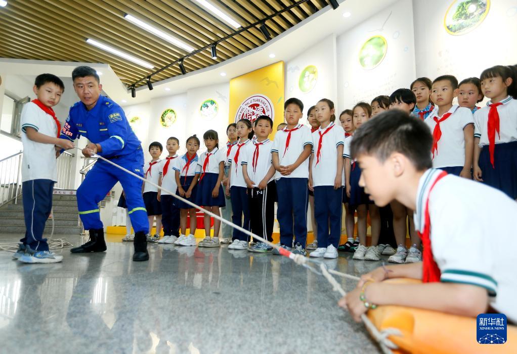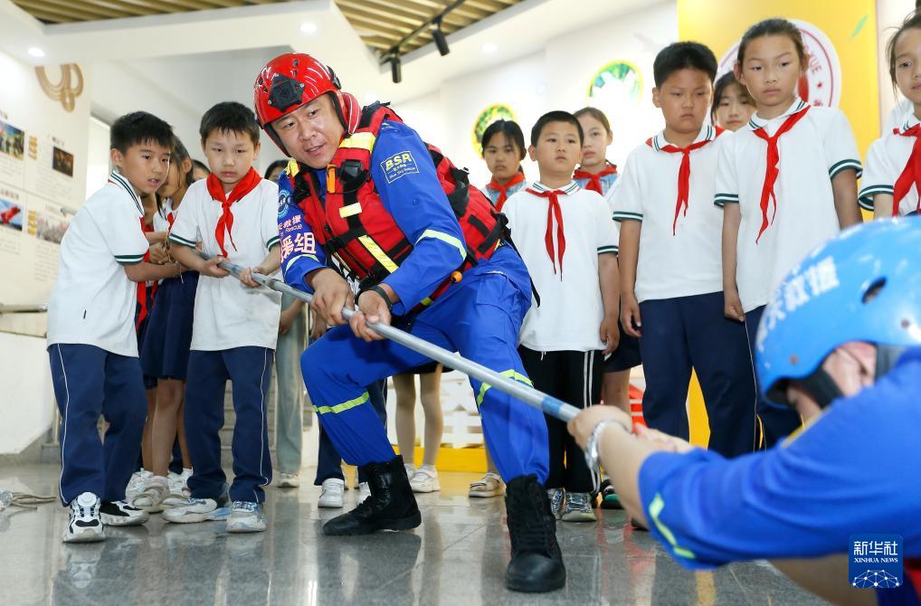 6月17日,蓝天救援队志愿者为山东省青岛市即墨区金口镇周疃小学的学生讲解救生杆的使用方法。(新华社发 梁孝鹏 摄)