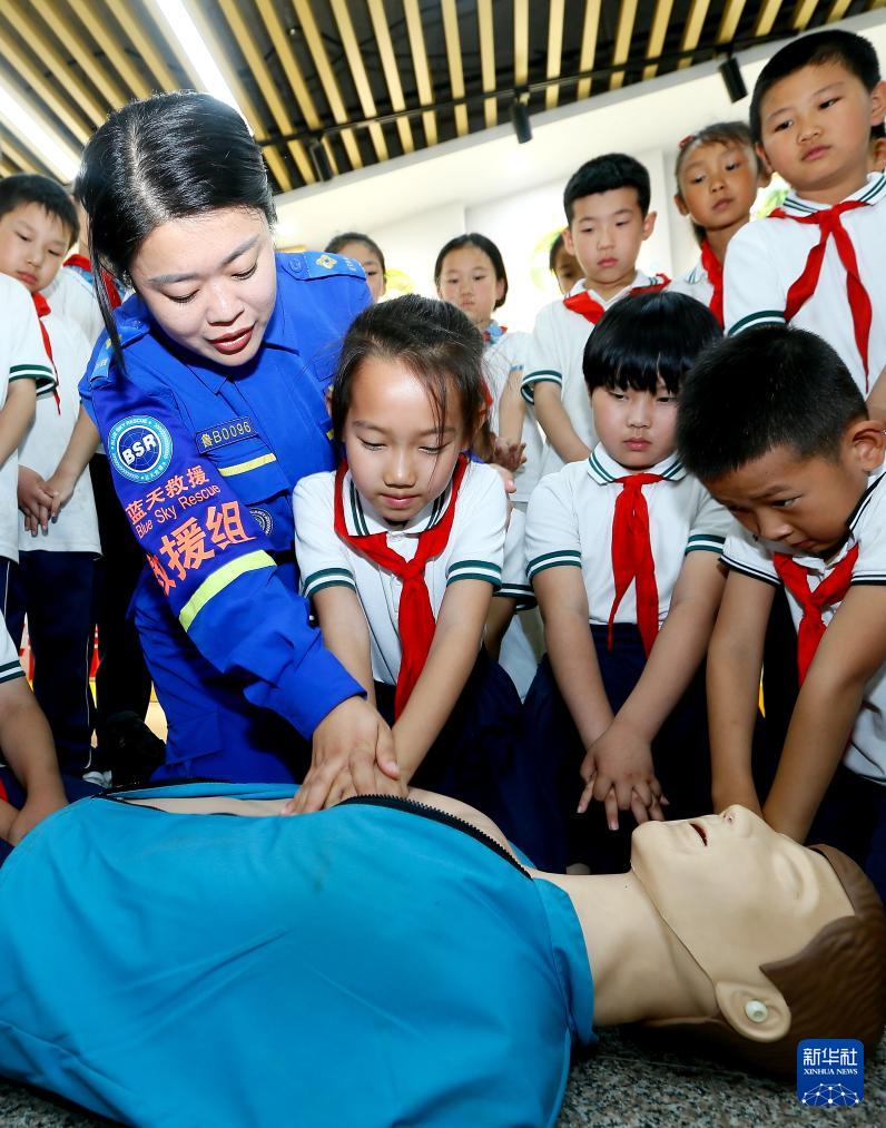暑假临近,山东省青岛市即墨区金口镇周疃小学开展以“珍爱生命 预防溺水”为主题的安全教育活动,学生们在蓝天救援队志愿者的指导下学习防溺水常识、演练安全急救技能,提高安全意识和自救能力。