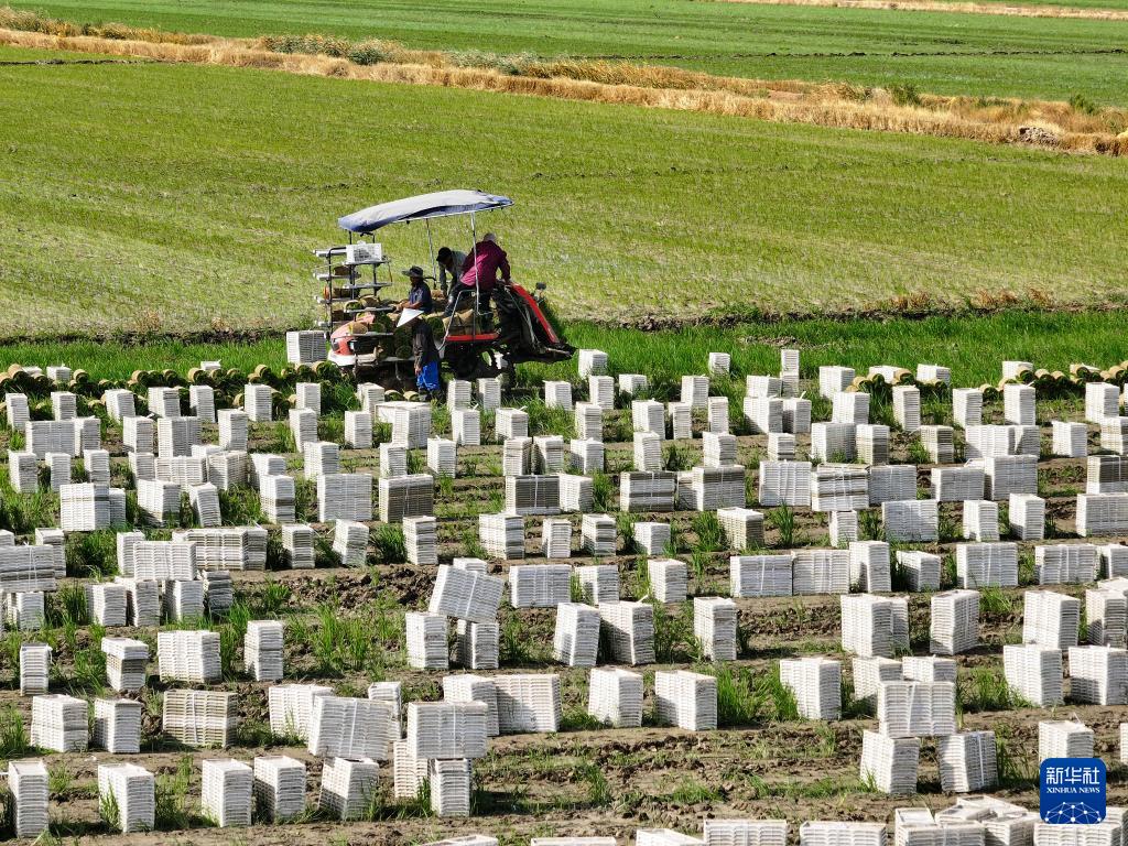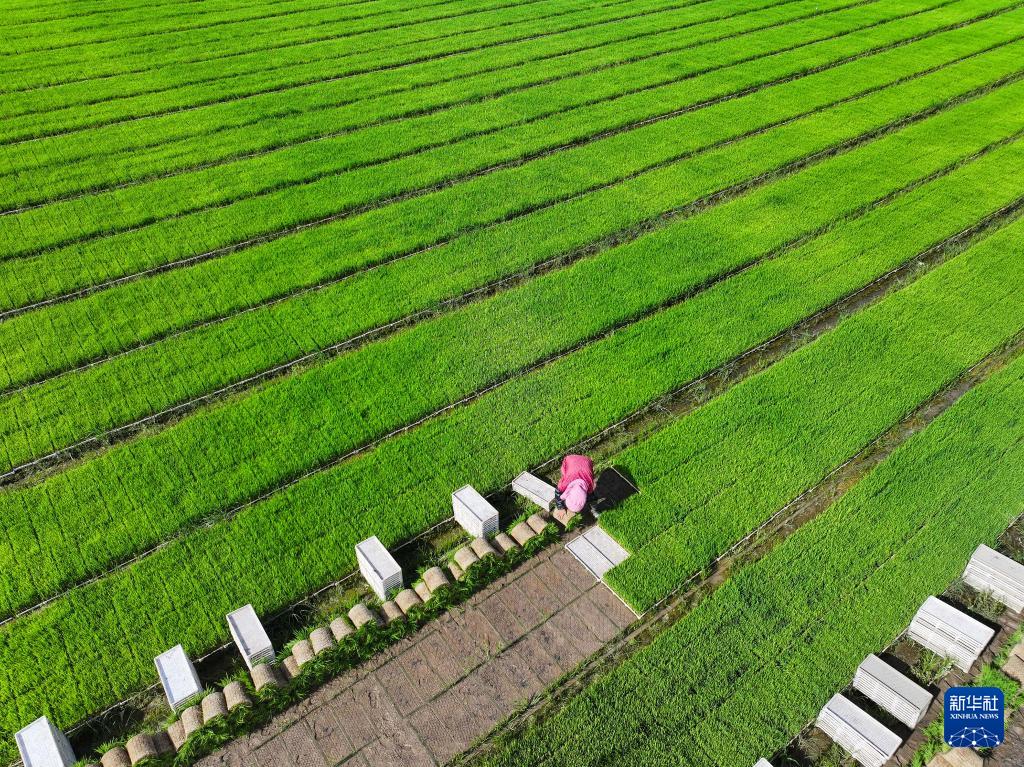 6月18日,起秧工将秧苗放到插秧机上(无人机照片)。(新华社记者 季春鹏 摄)