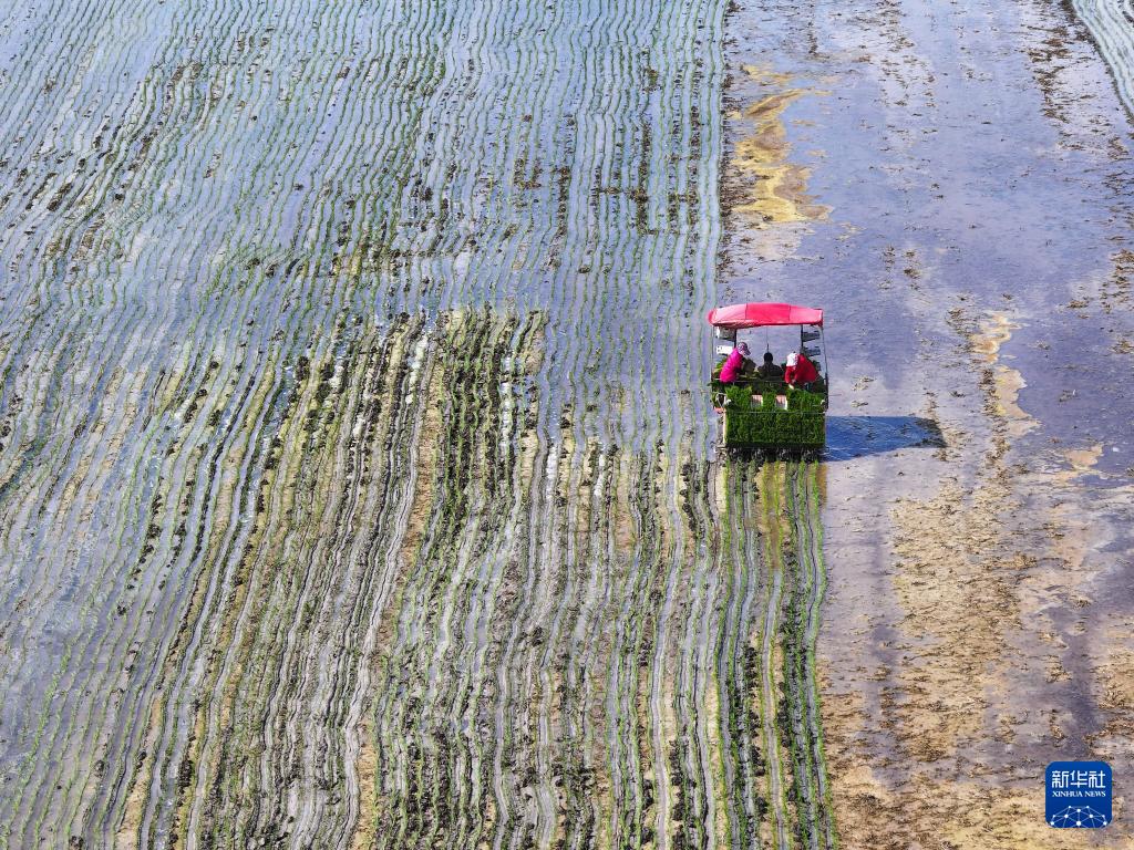 6月18日,插秧机在临海农场一块水田作业(无人机照片)。(新华社记者 季春鹏 摄)