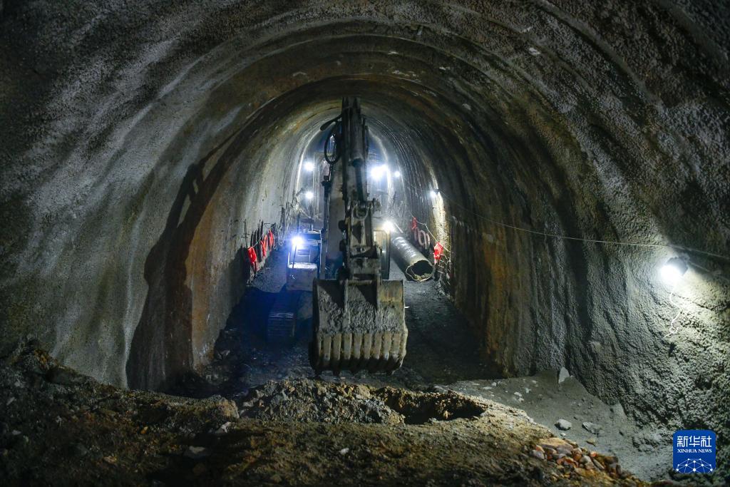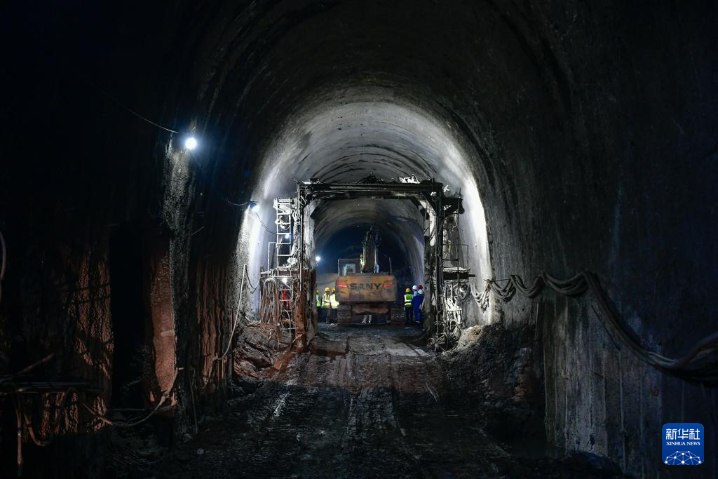 6月18日,工人驾驶挖掘机在贵州瓮马铁路南北延伸线桃花坪隧道内施工。(新华社记者 杨文斌 摄)