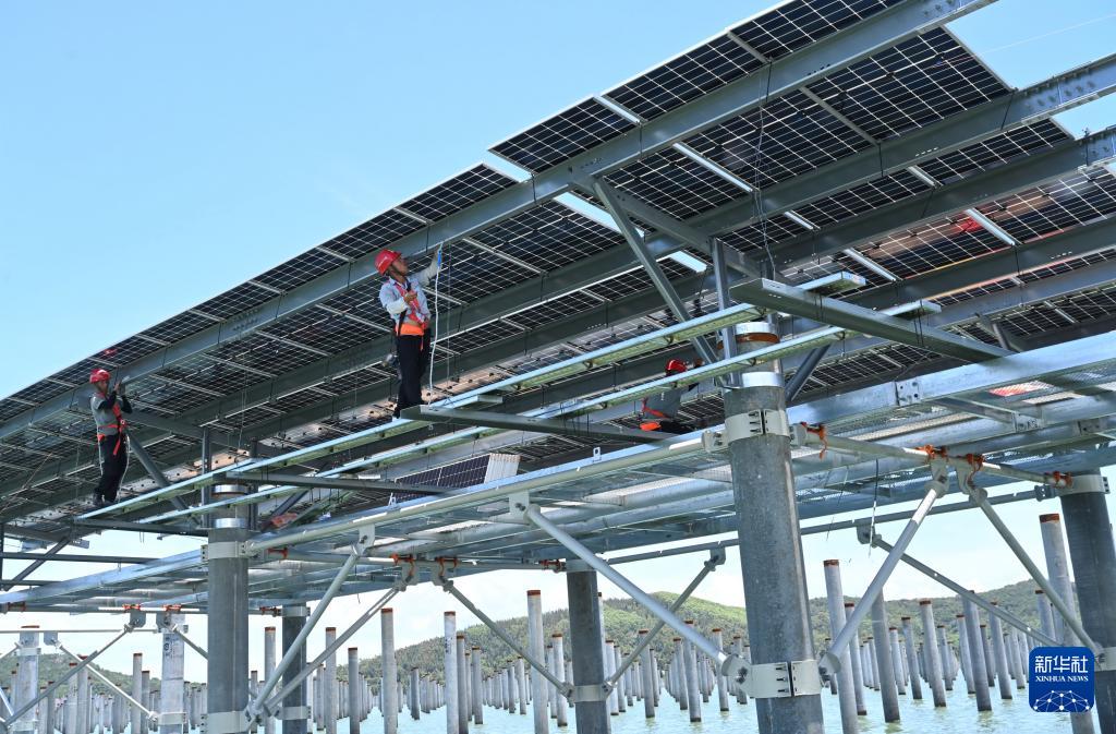 6月20日,施工人员在海上光伏电站现场安装支架和光伏组件。(新华社记者 林善传 摄)