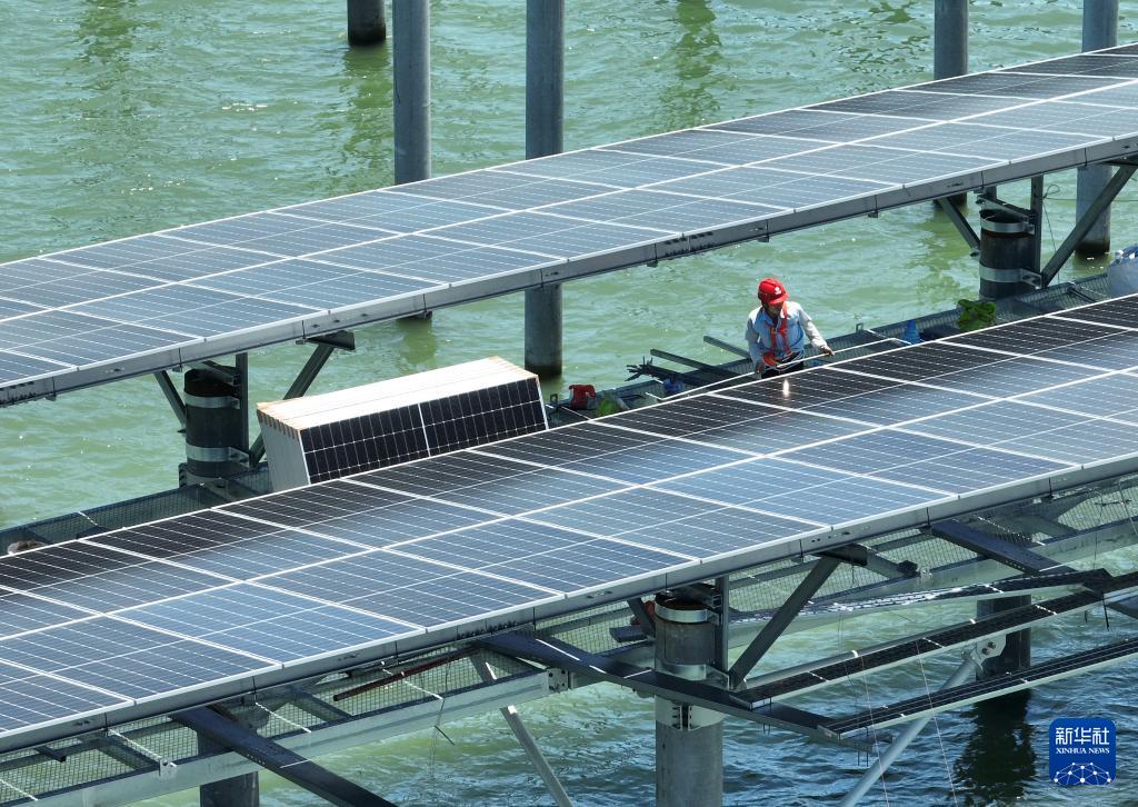 6月20日,施工人员在海上光伏电站现场进行安装作业。(新华社记者 林善传 摄)