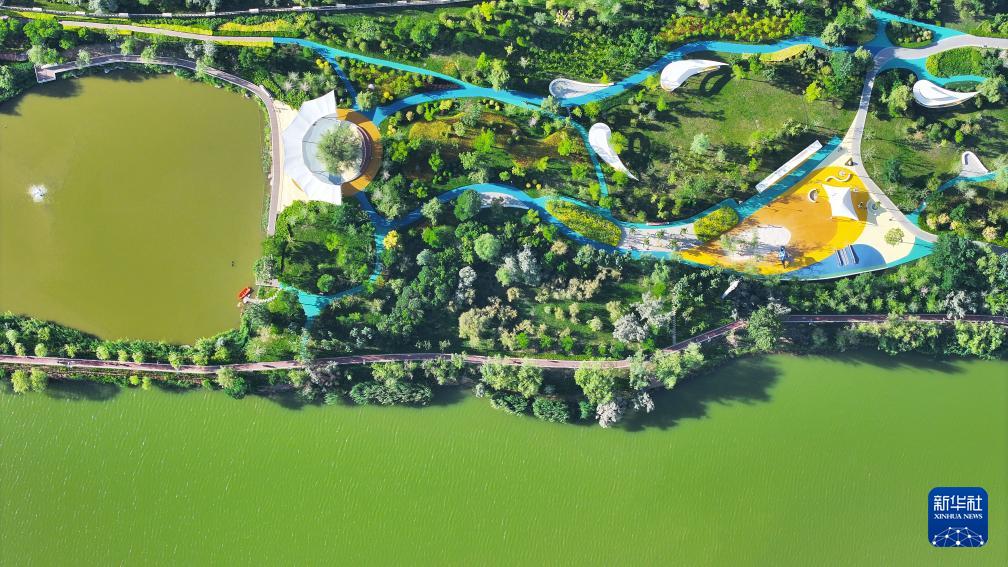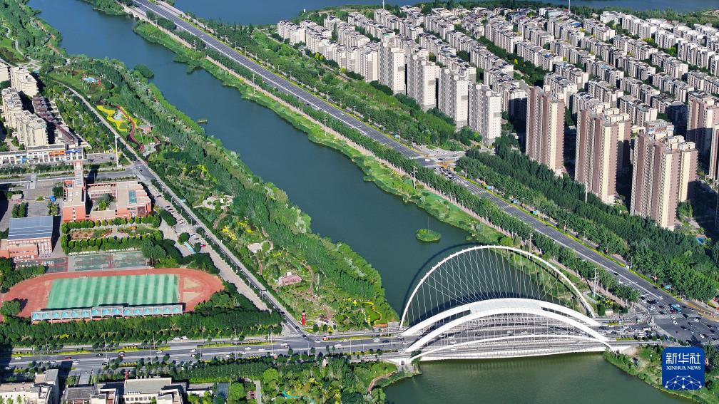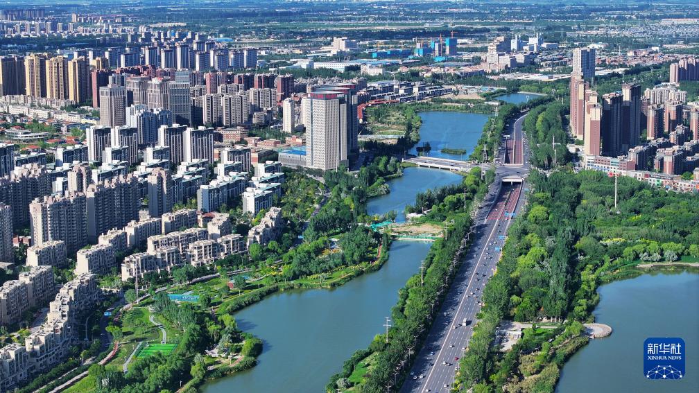 这是6月23日拍摄的宁夏银川市典农河周边景色(无人机照片)。(新华社记者 王鹏 摄)