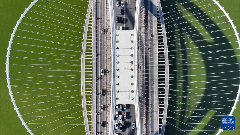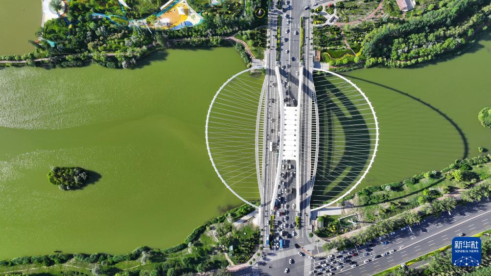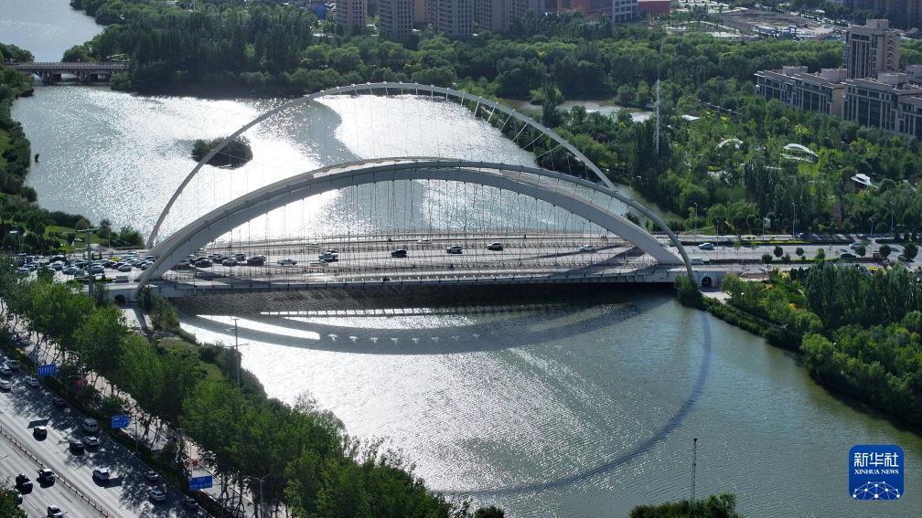这是6月23日拍摄的位于宁夏银川市典农河上的凤凰桥(无人机照片)。(新华社记者 王鹏 摄)