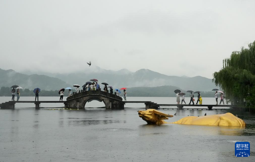 6月24日是第5个“杭州西湖日”,游客冒雨在杭州西湖景区观光游览。