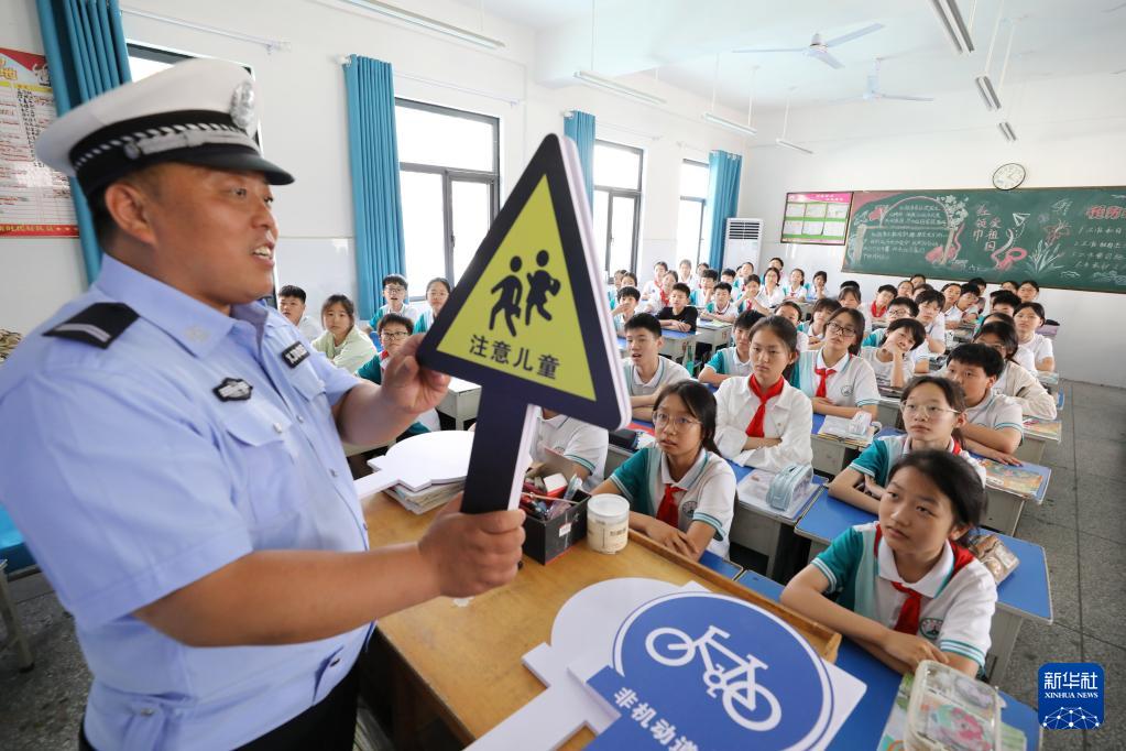 6月24日,民警在河北省秦皇岛市卢龙县第四实验小学向学生讲解交通安全知识。(新华社发 刘满仓 摄)