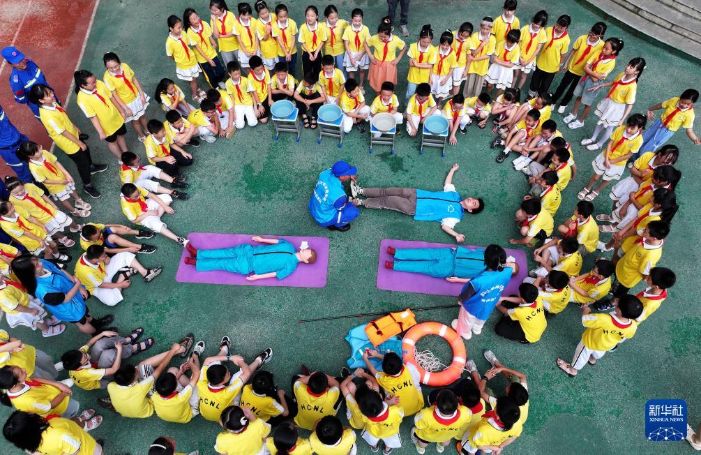6月24日,在湖南省衡阳市雁峰区环城南路小学,南华大学体育学院防溺水安全知识宣讲团的志愿者们指导小学生们学习防溺水自救互救的基本知识与技能(无人机照片)。(新华社发 曹正平 摄)