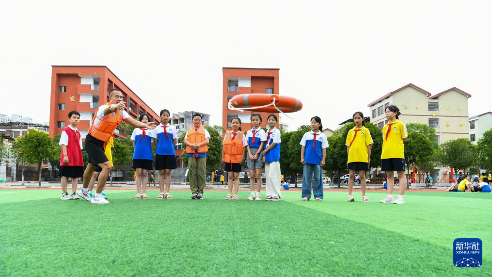 6月24日,湖南省常宁市宜城小学的老师在向学生讲授如何正确使用救生圈。(新华社发 周秀鱼春 摄)