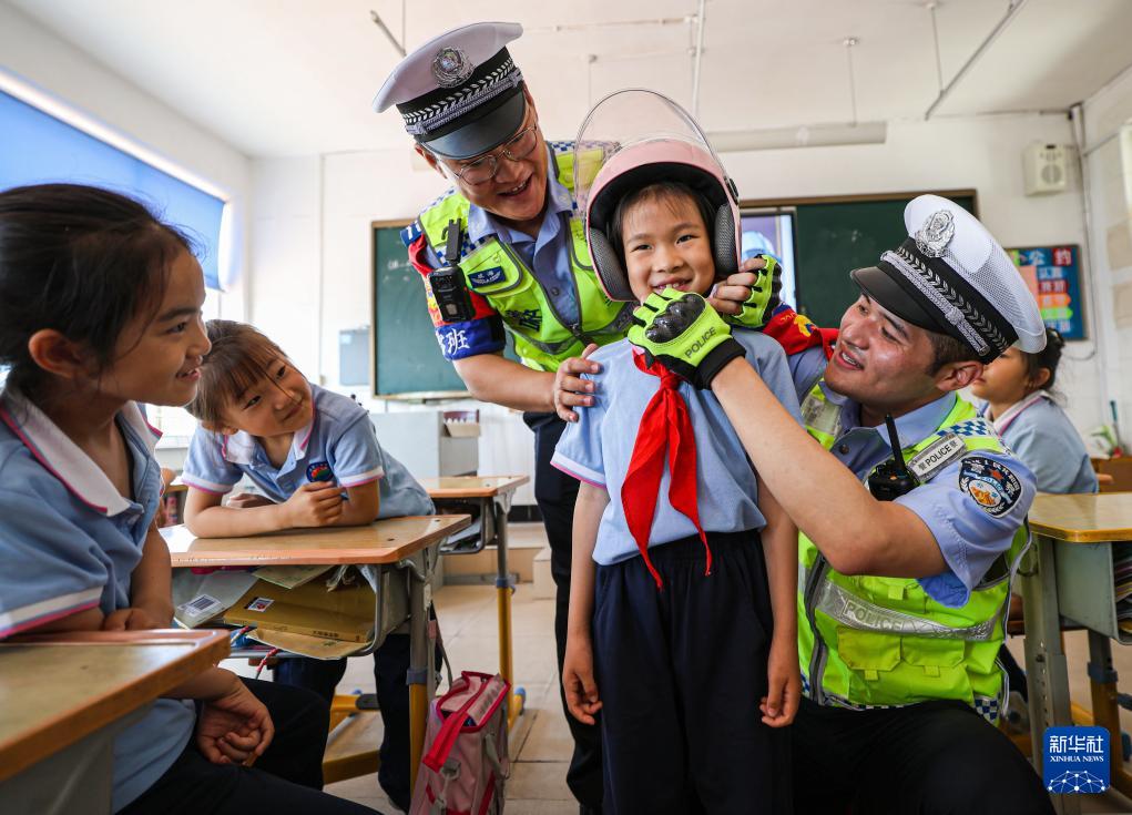 6月24日,在山东省荣成市府新小学,民警指导小学生正确佩戴安全头盔。(新华社发 李信君 摄)