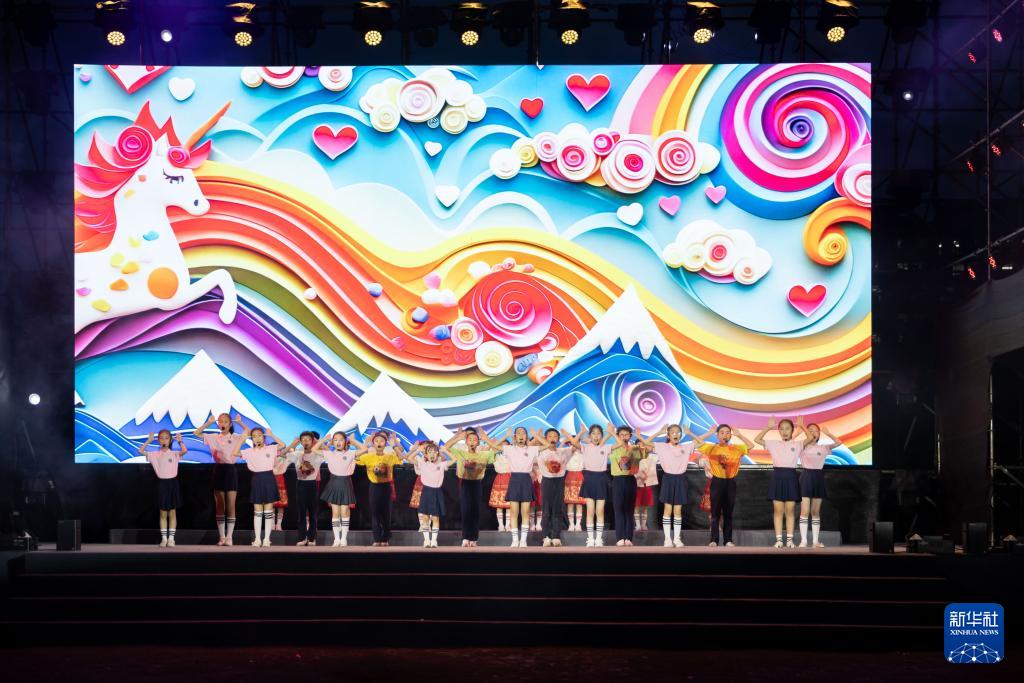7月2日,上海师范大学附属闵行第三小学合唱社团与浦锦街道童声合唱团共同演唱歌曲。(新华社记者 王翔 摄)