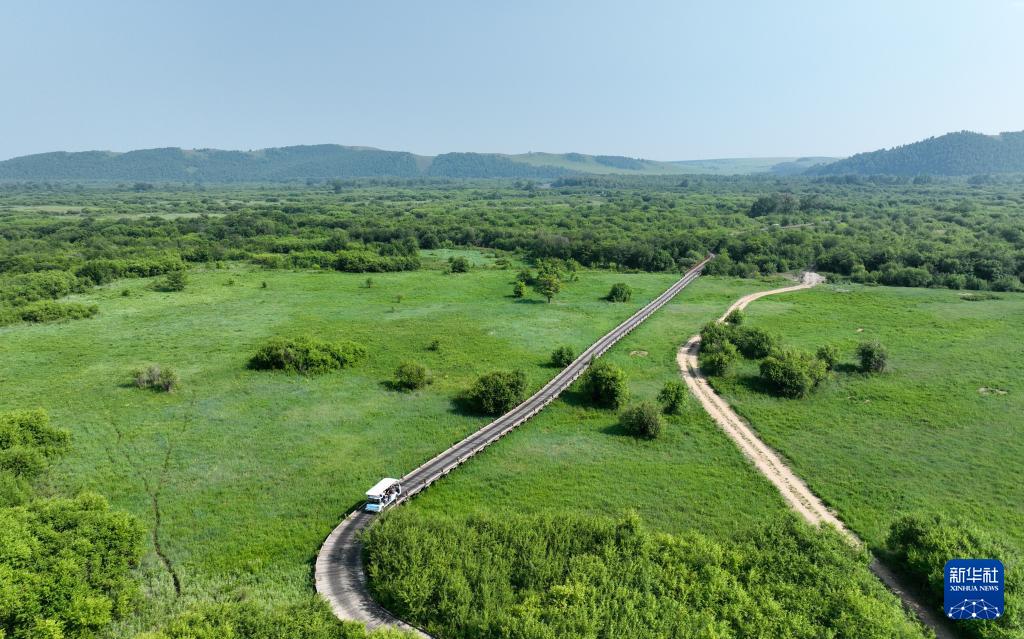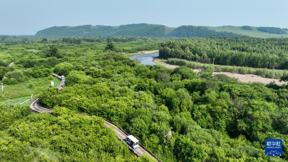 7月2日,游客乘车在额尔古纳市额尔古纳国家湿地公园游玩(无人机照片)。(新华社记者 贝赫 摄)
