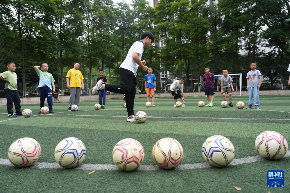 7月4日,在重庆市北碚区水土街道和悦家园社区,小朋友在大学生志愿者指导下练习踢足球。(新华社发 秦廷富 摄)