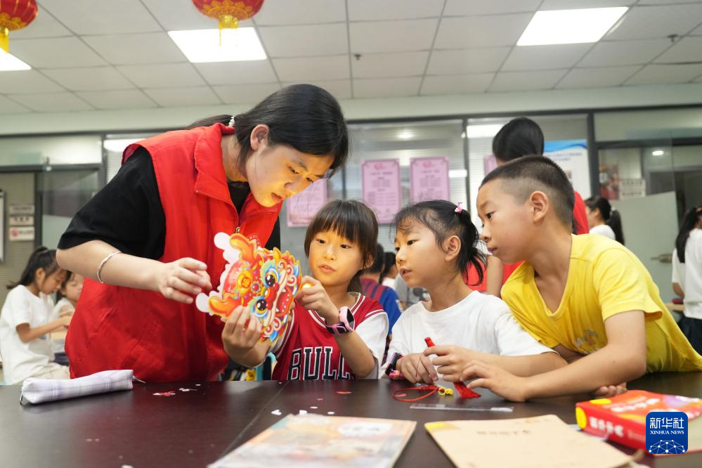 7月4日,在重庆市北碚区水土街道和悦家园社区,大学生志愿者和小朋友们一起做灯笼。(新华社发 秦廷富 摄)