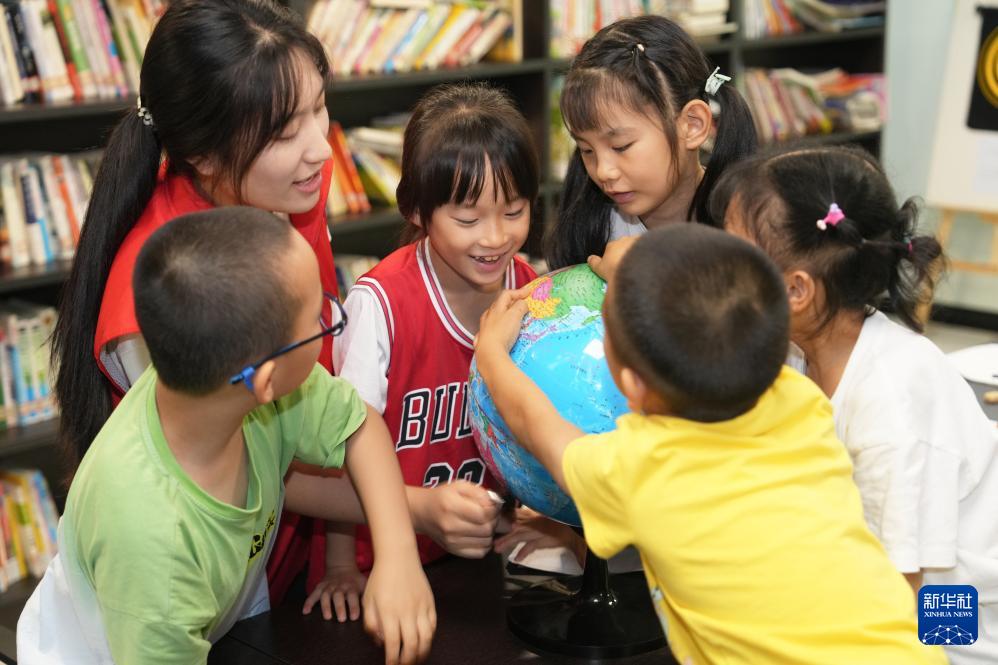 7月4日,在重庆市北碚区水土街道和悦家园社区,大学生志愿者在给小朋友介绍地理知识。(新华社发 秦廷富 摄)
