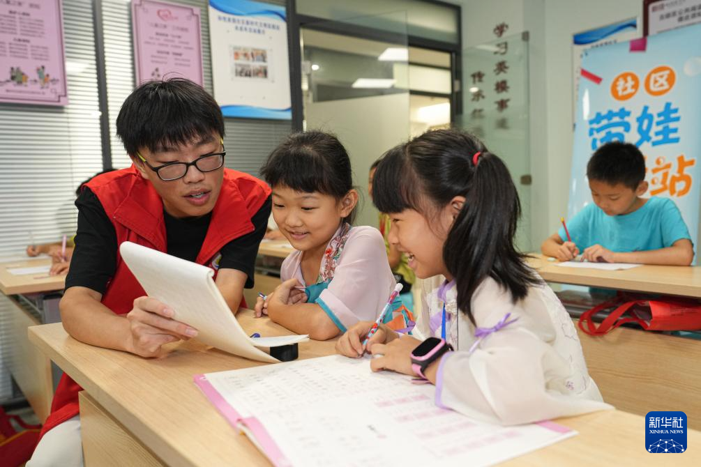 7月4日,在重庆市北碚区水土街道和悦家园社区,大学生志愿者在给小朋友讲解硬笔书法知识。(新华社发 秦廷富 摄)