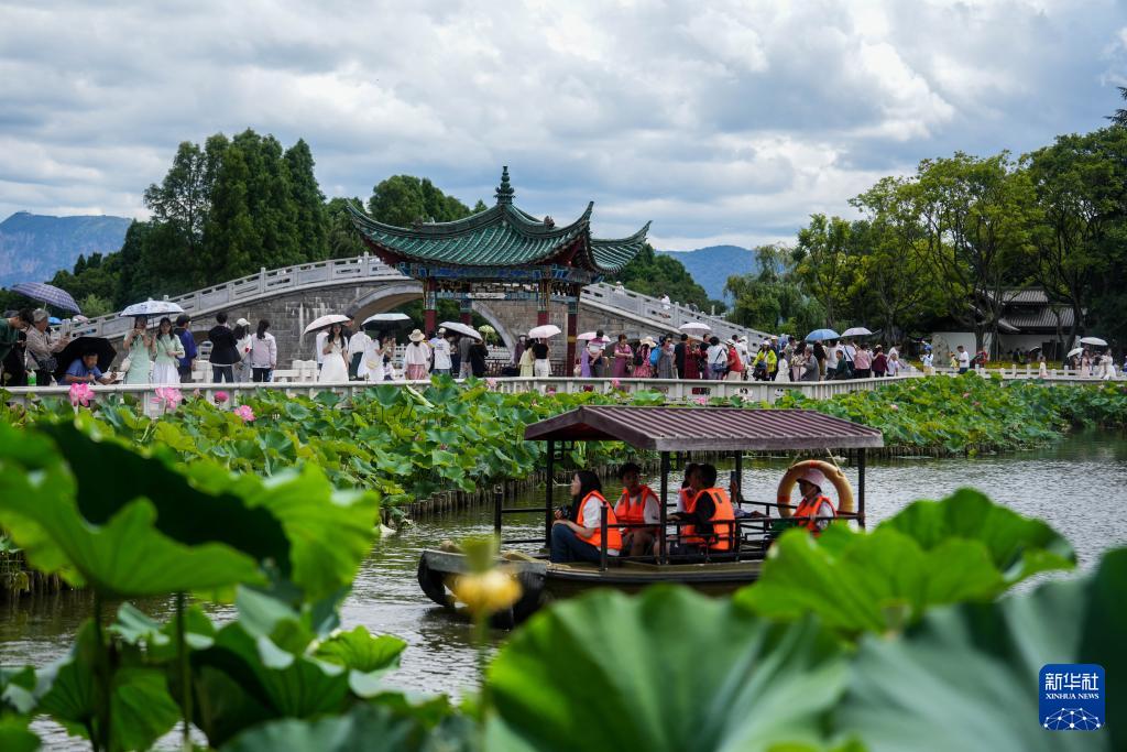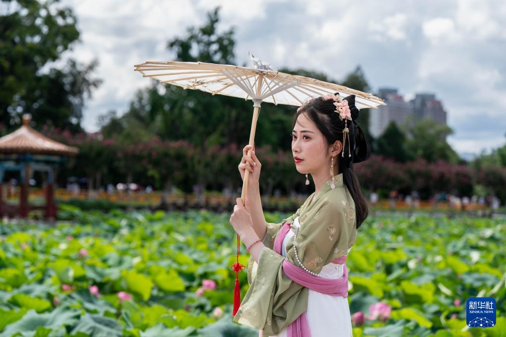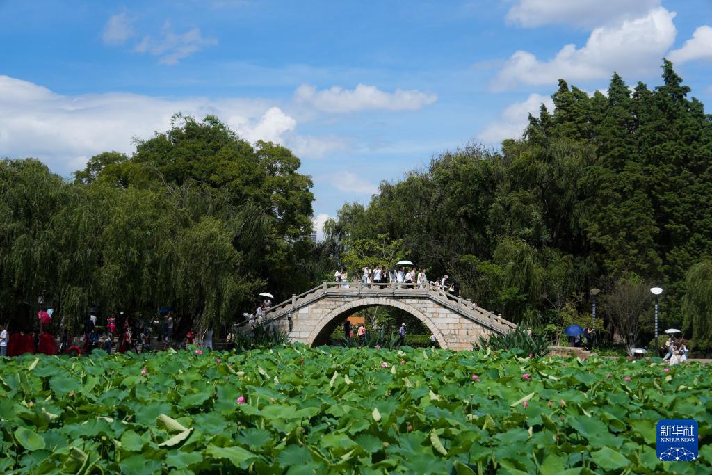 近日,云南省昆明市大观公园内的百亩荷花陆续盛开,吸引众多市民前来赏荷、拍照。