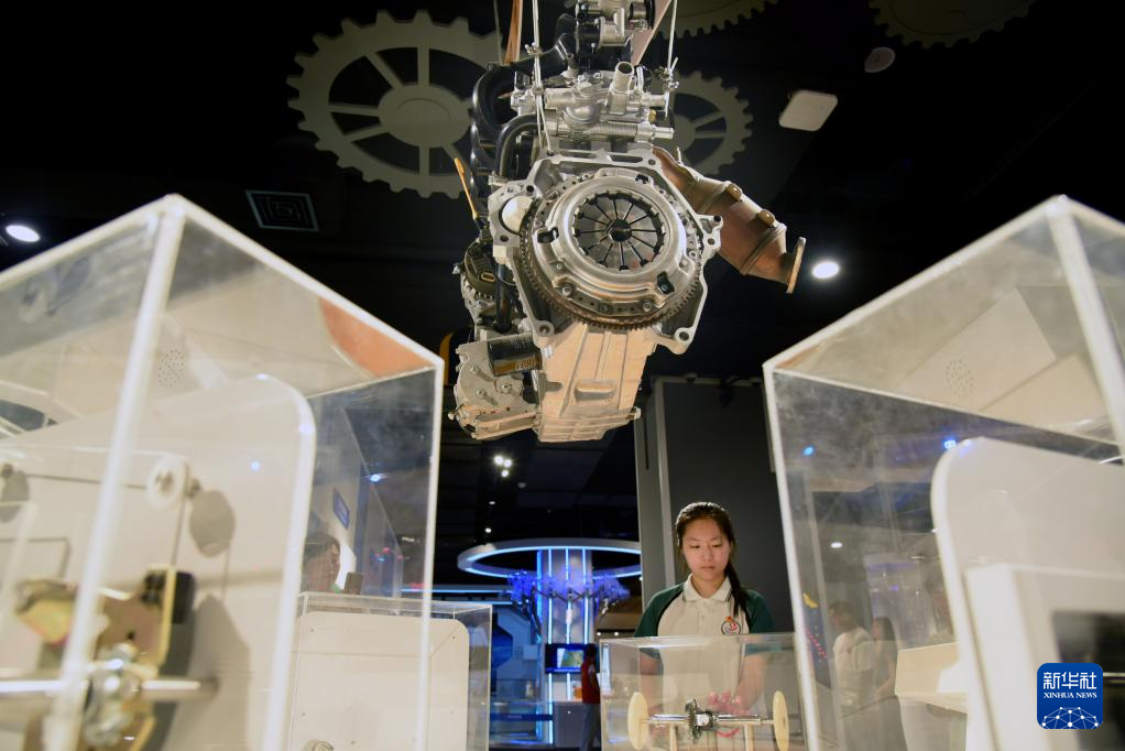 7月7日,一名中学生在山东省枣庄市科技馆了解内燃机工作原理。(新华社发 刘明祥 摄)
