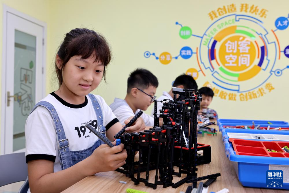 7月7日,学生在山东省枣庄市科普基地学习组装机器人。(新华社发 孙中喆 摄)
