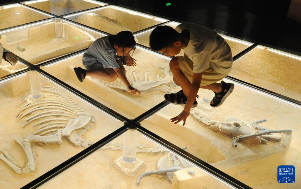 7月6日,孩子们在山东省滕州博物馆内参观。(新华社发 李志军 摄)