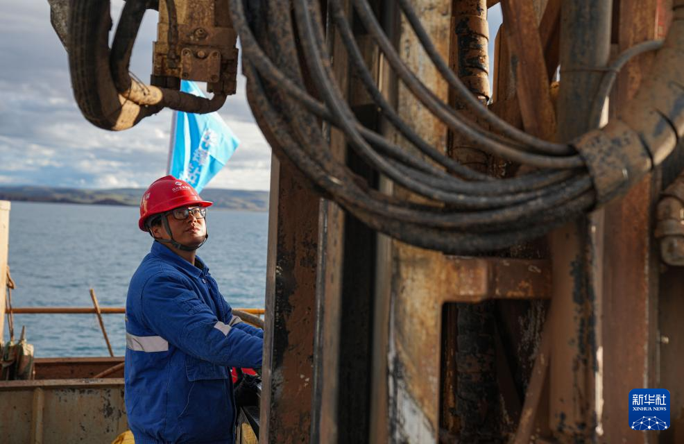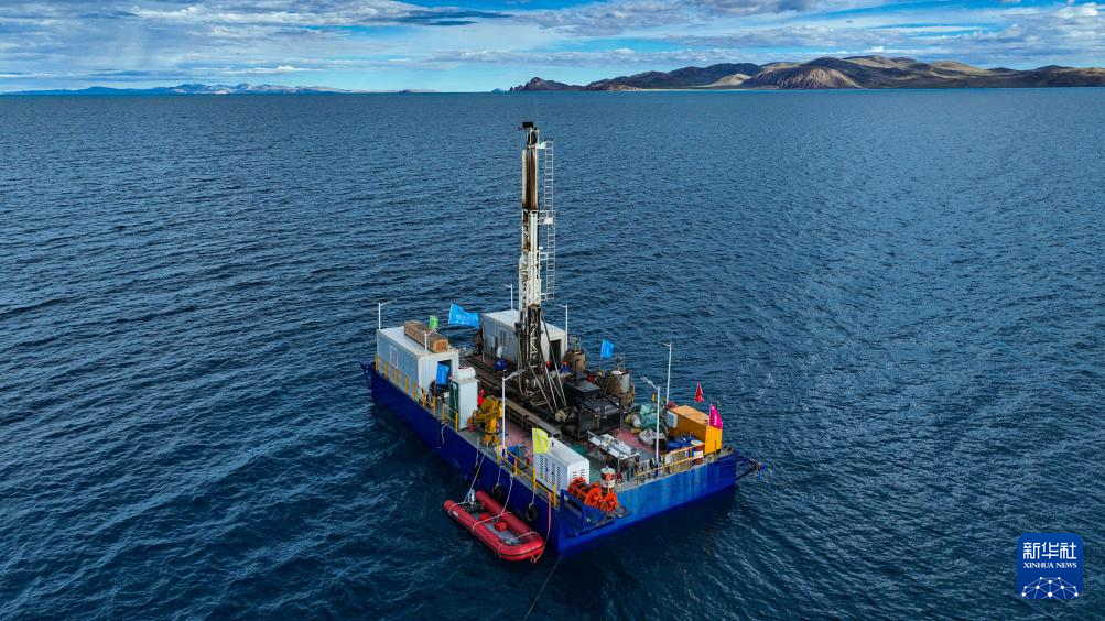 在海拔超过4700米的西藏纳木错,湖泊岩芯钻探工作正在开展中。