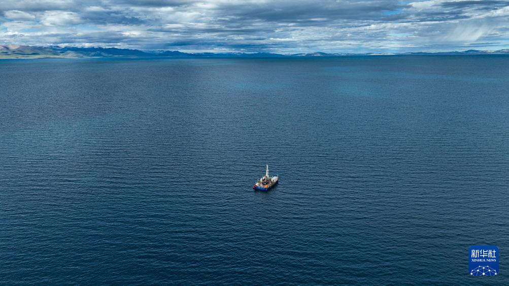 7月11日拍摄的纳木错水上钻探平台(无人机照片)。(新华社记者 晋美多吉 摄)