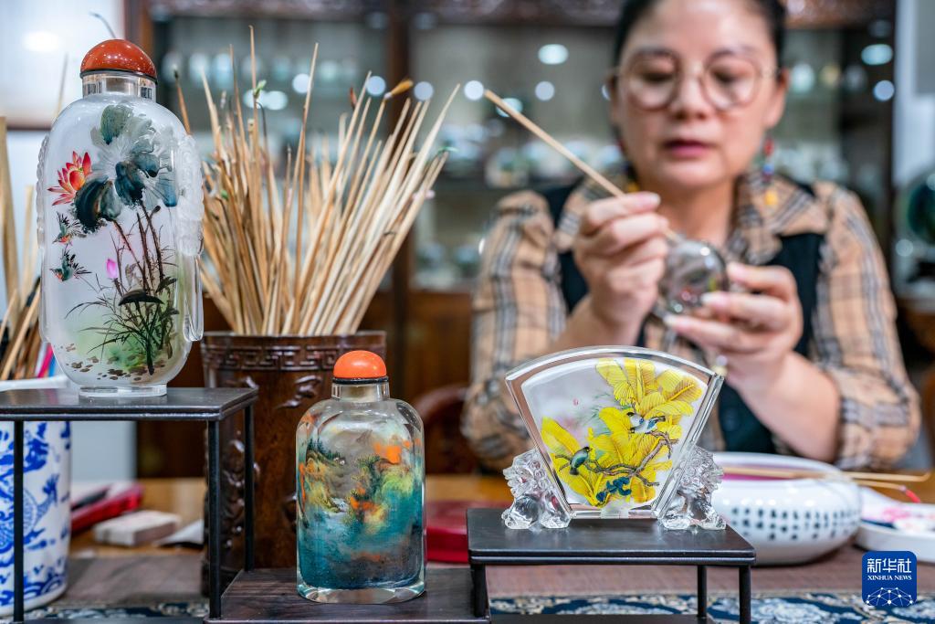 滇派内画在坚守传统技艺的同时,通过颜料、工具的创新,以及紧跟时代的设计风格,收获了许多年轻人青睐。“作为文化载体的非遗技艺也要与时俱进,接纳并满足不同时代的社会需求,在不断创新中把古老技艺传承下去。”孙鸿雁说。